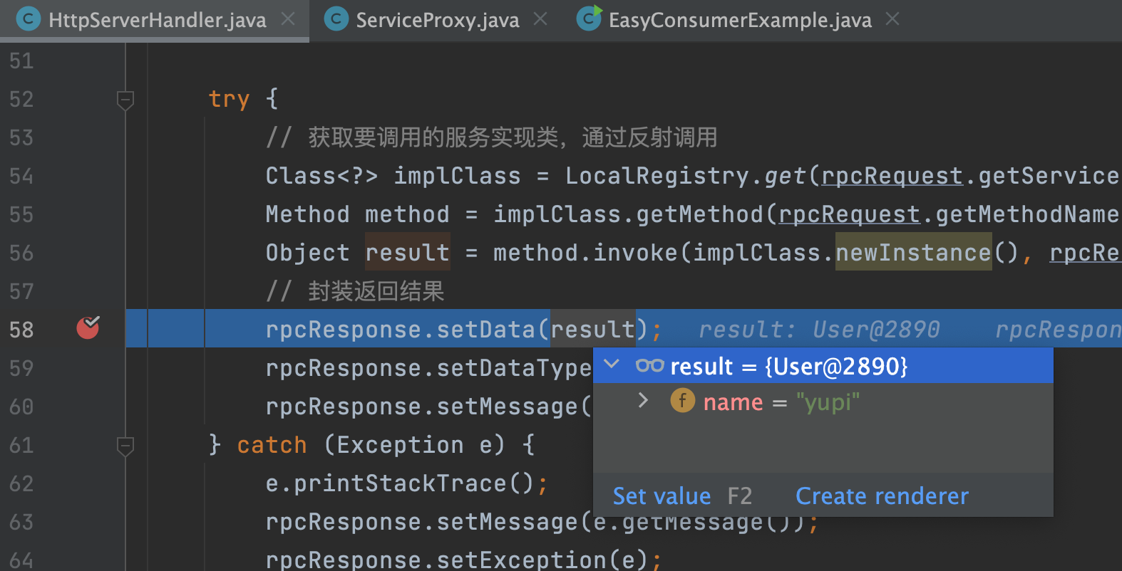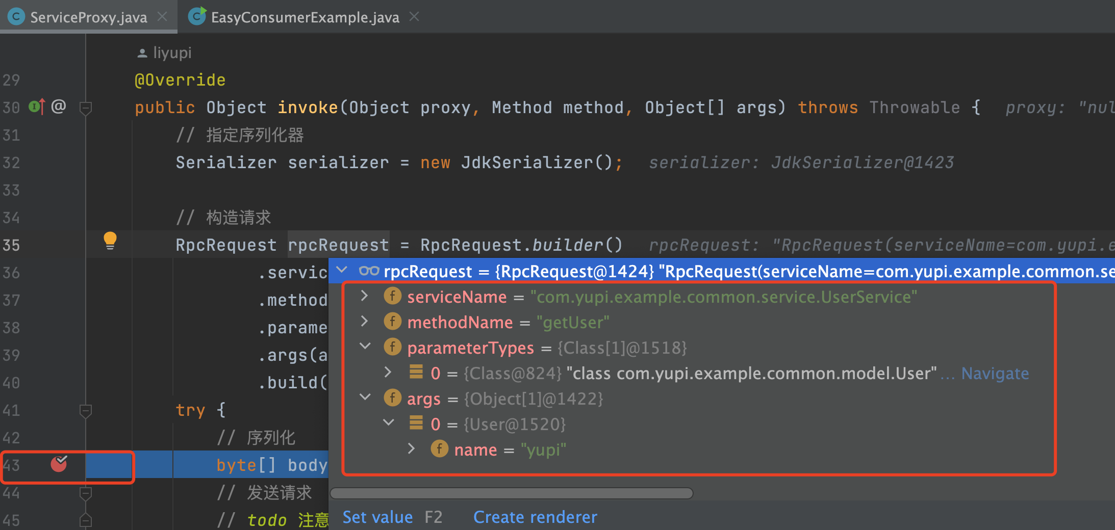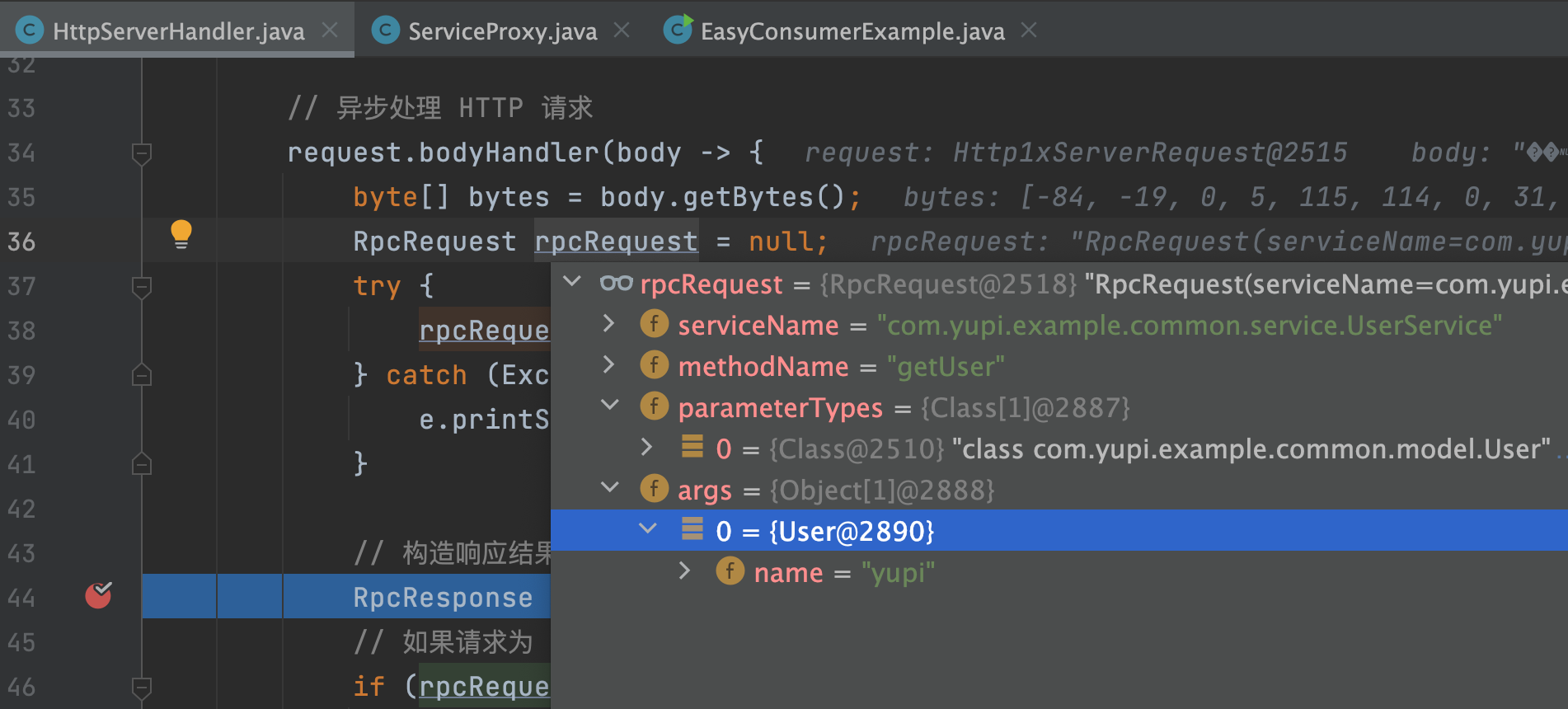4)在服务提供者模块的请求处理器中打断点,可以看到接受并反序列化后的请求,跟发送时的内容一致: