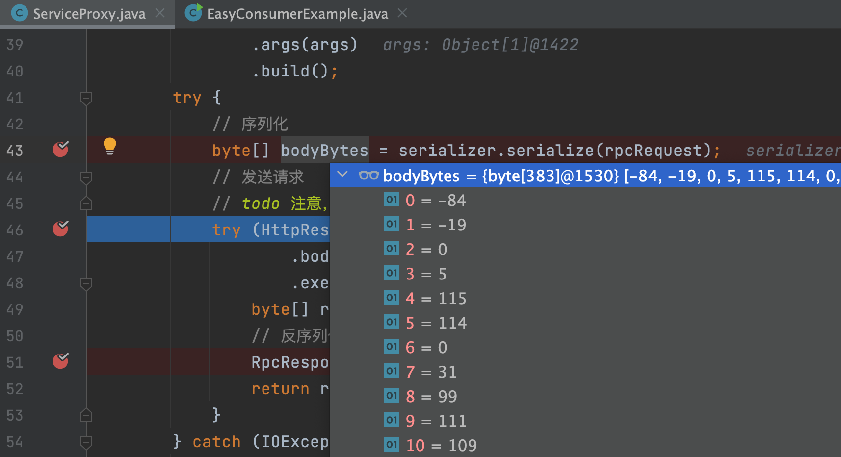 3)继续 debug,可以看到序列化后的请求对象,结构是字节数组:
