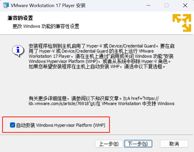 这里要注意勾选 “自动安装 Windows Hypervisor Platform” 和 “将 VMware Workstation 控制台工具添加到系统 PATH” 两个选项: