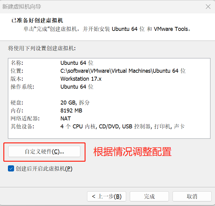 指定完操作系统后,我们继续新建虚拟机,可以根据实际的电脑情况来自定义虚拟机的硬件。如果你的电脑配置还不错,内存和 CPU 可以分配多一点: