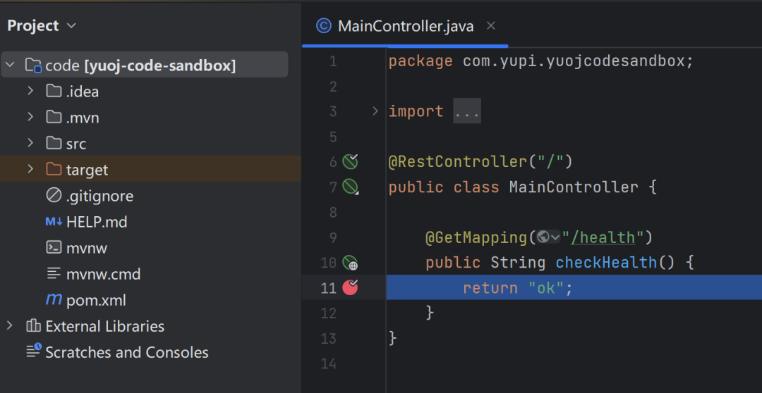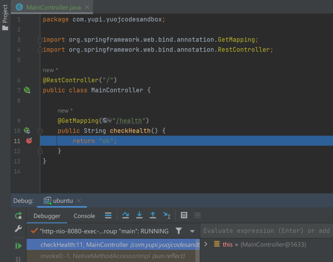 接下来访问本机地址 http://127.0.0.1:8080/health,就能够访问到项目啦,而且直接支持 Debug!无须做任何多余的配置!