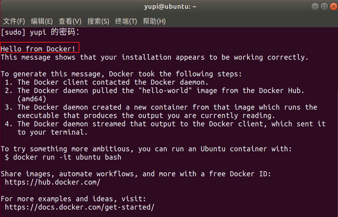 能看到如下信息,表示 Docker 安装成功: