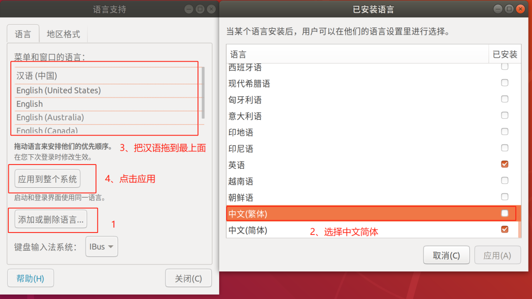 然后点击添加语言,选择中文简体,并且把汉语拖到语言列表的最上面,最后点击应用到整个系统: