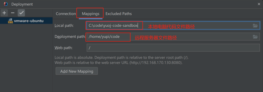 回到部署界面,点击 Mappings 来配置路径映射,就是把本地电脑的文件同步到远程服务器的指定路径: