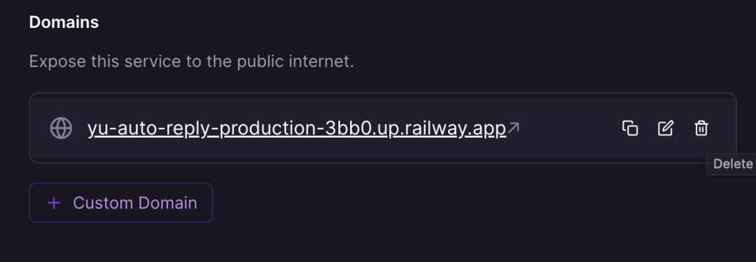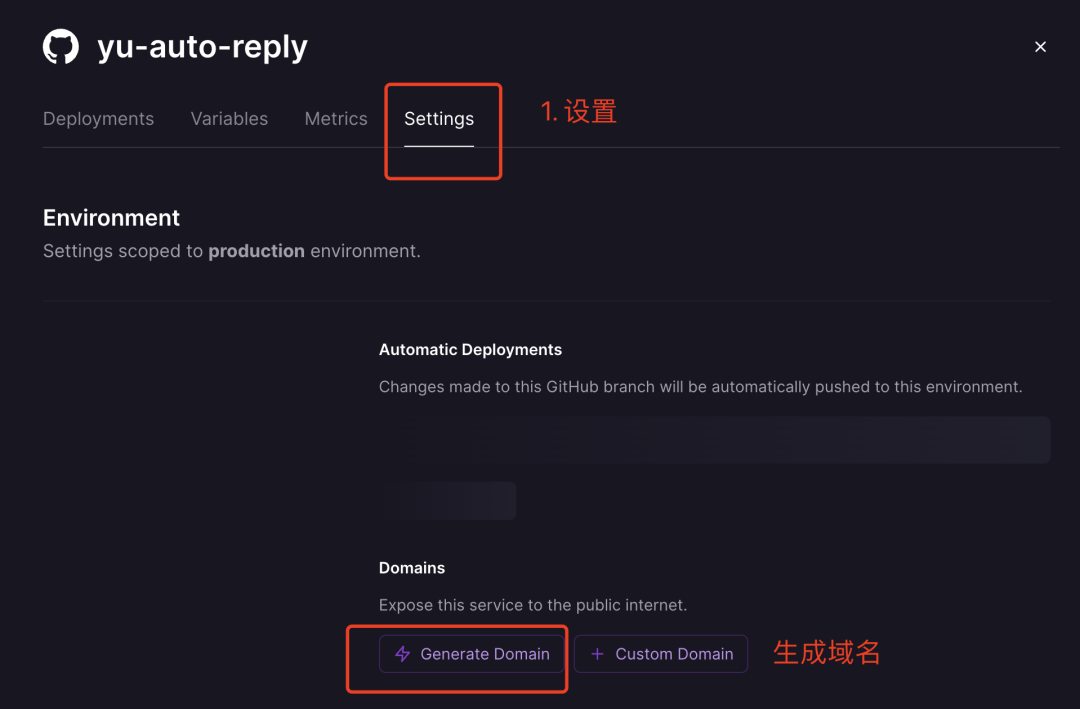 也非常简单!进入设置界面,点击下方的 Generate Domain 来生成域名即可~ 当然,如果你有域名的话,也可以绑定自己的域名。