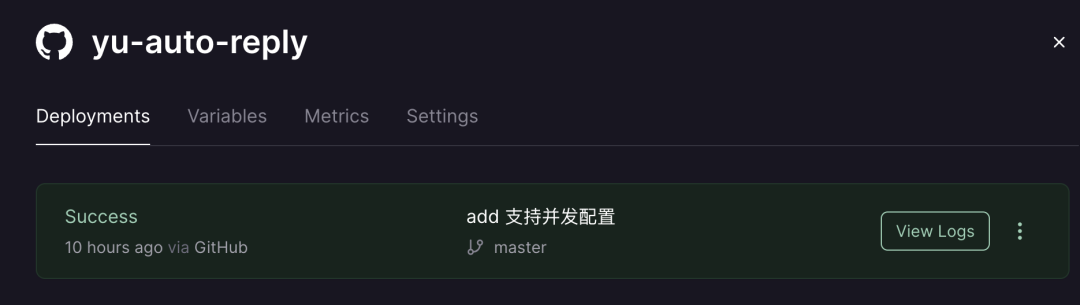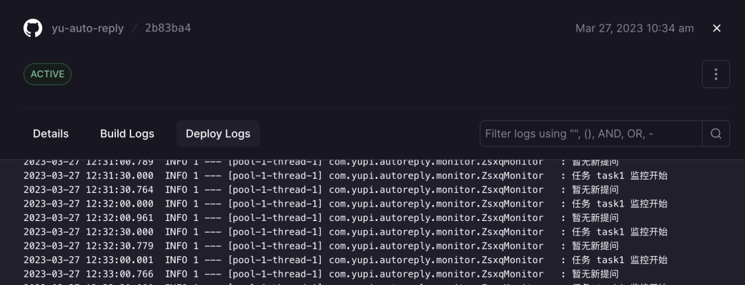 点击上图的 View Logs,就能查看项目的部署日志,了解其运行情况: