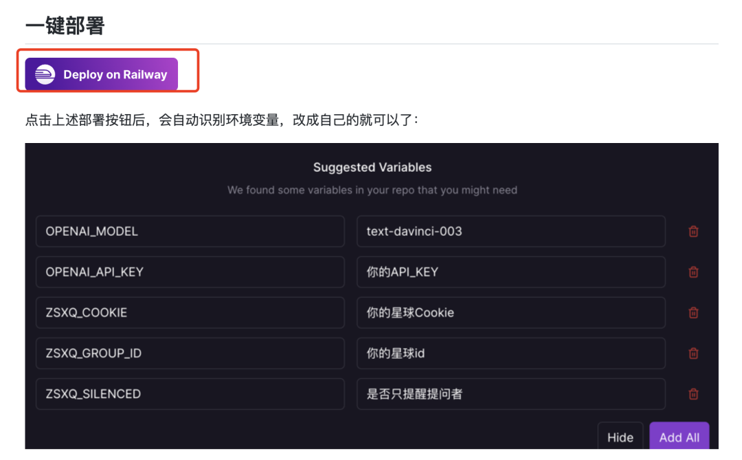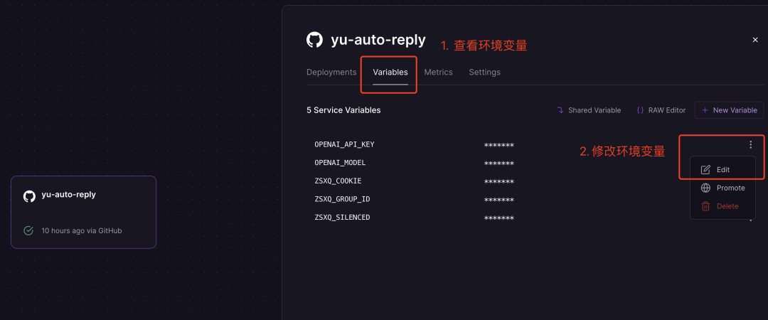 为了启动这个项目,你需要先修改环境变量(类似于程序的启动参数)。比如我这个自动回复用到了 Open AI 的接口秘钥,你要把这个秘钥改成自己的: