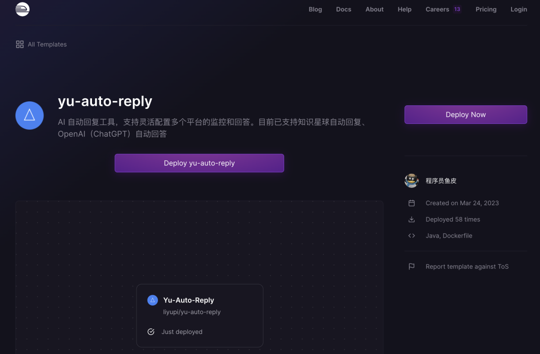 这里以我刚刚开源的自动回复项目为例,给大家演示下怎么用这个平台一键部署项目。