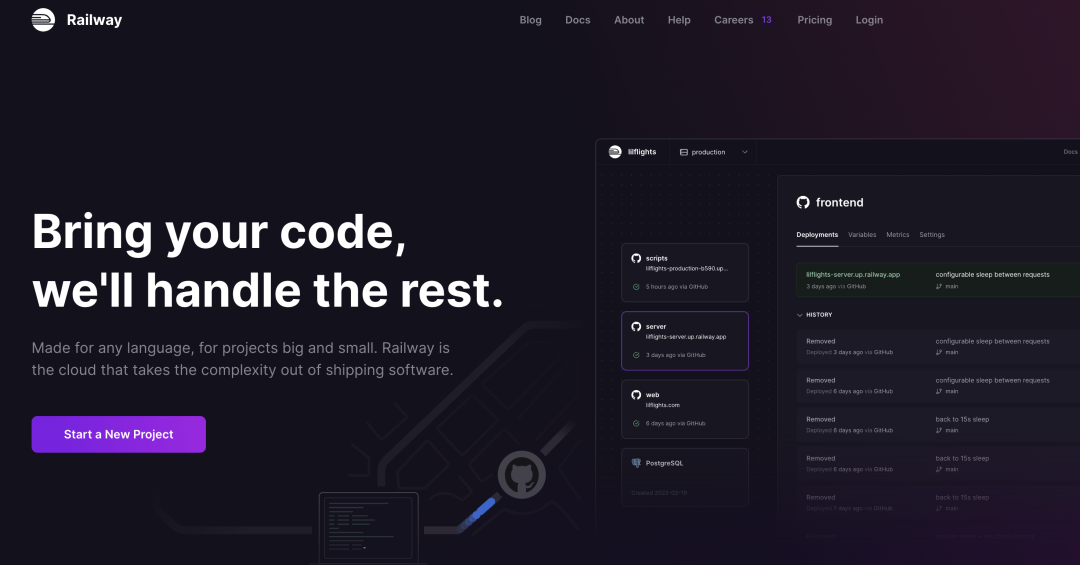 这个平台就是 Railway,和之前给大家分享过的 Vercel 平台有点像,不过 Vercel 一般是用于部署前端网页的,而 Railway 部署的是容器,你可以在容器里放网站、后端程序、定时任务、数据库等等。