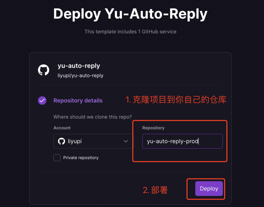 登录后,平台要帮你把鱼皮的项目克隆到你自己的 GitHub 仓库,这里需要填写一个仓库名称,别和自己之前的项目冲突就行~ 然后点击部署: