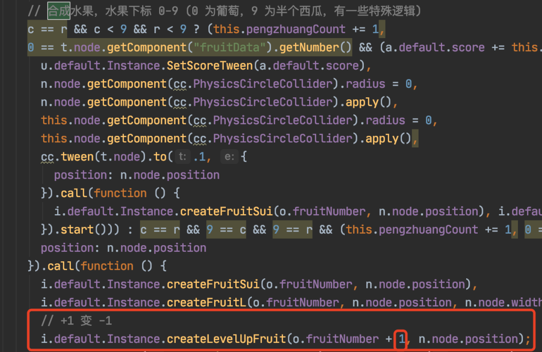 如果把水果膨胀理解为 “升级”,那说白了,就是反转下水果的升级顺序。这里的代码不是很好定位,主要是先找到水果的合成逻辑,可以通过搜索边界值(比如 < 9)、或者关键词 LevelUp 的方式找到下面代码,将 "+1" 变为 "-1" 即可!