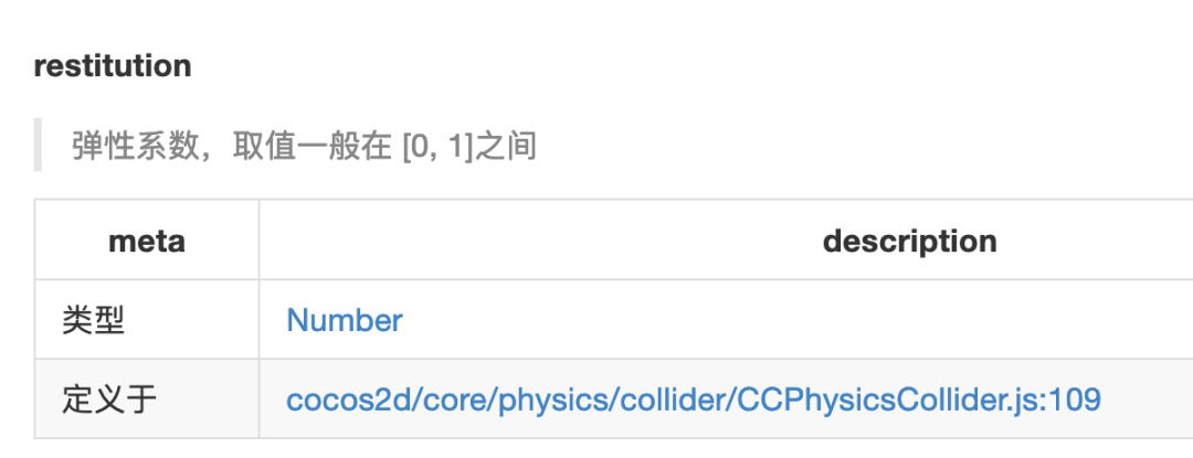 由于整个游戏是基于 cocos2d 开发,我们可以看看官方 API 文档中,该物理引擎有哪些参数,很快就找到了弹性系数:
