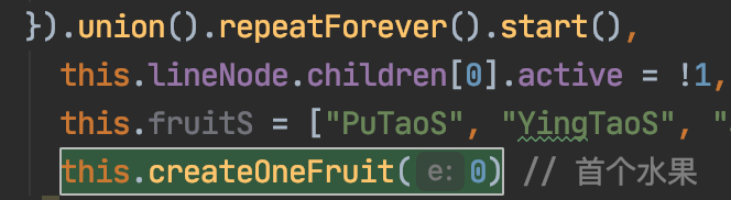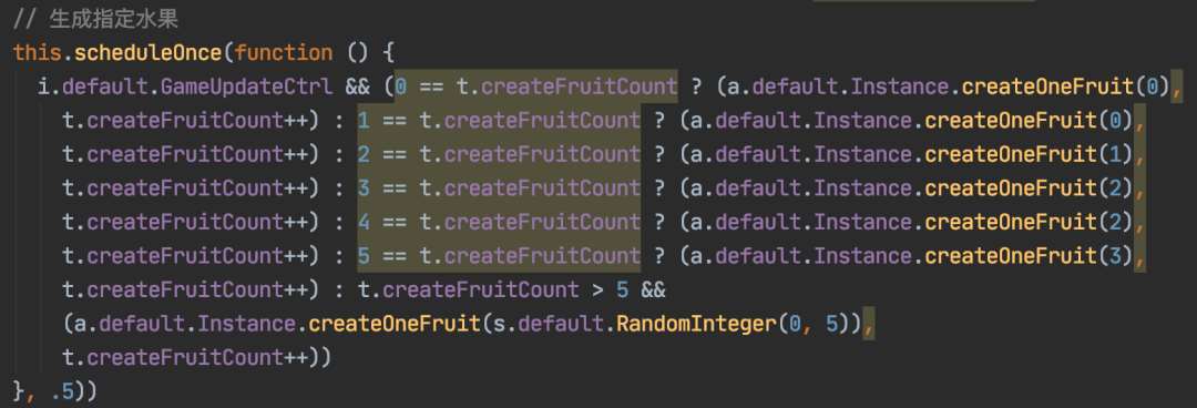 当然,同样的思路,先找到水果生成的逻辑在代码的哪个位置。通过搜索 "fruit"、"create" 等关键字,定位到了这段代码: