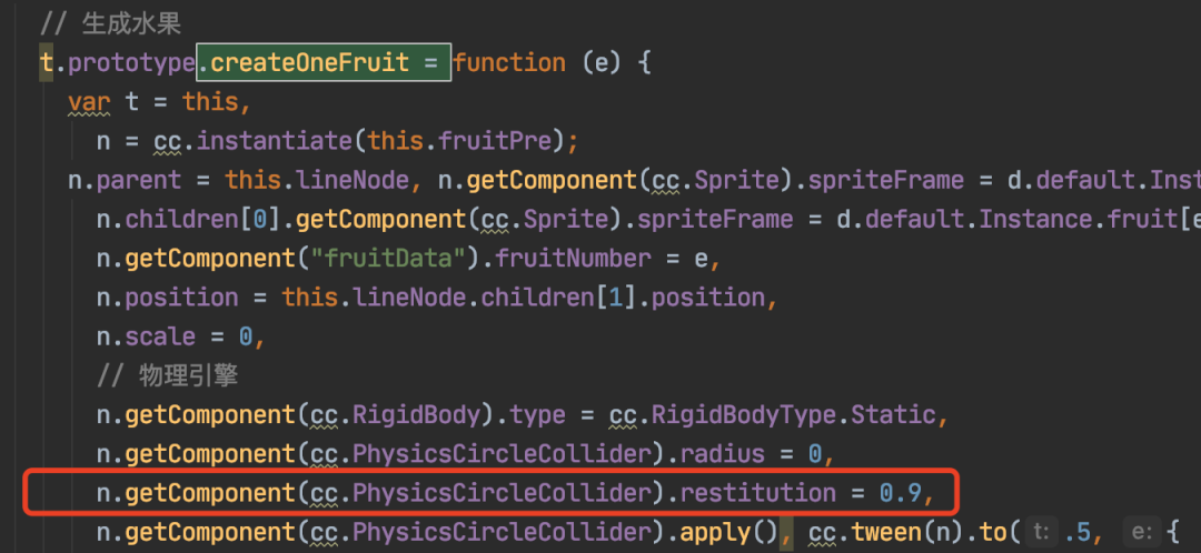 在生成水果的函数中,可以看到 cc.PhysicsCircleCollider,就是控制水果下落行为的物理引擎。