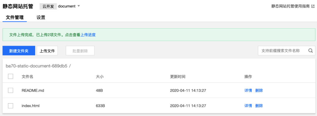 初始化完成后,自动进入刚刚创建的云开发环境。在文件管理页,点击上传文件,将本机mydocs目录下的index.html与README.md两个静态文件进行上传。