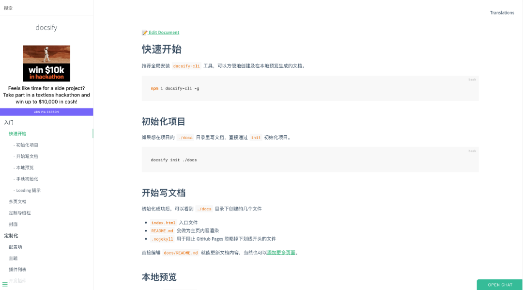 最后通过 docsify serve 命令在本地启动网站服务器,支持热加载,修改文档后自动更新,做到实时预览。