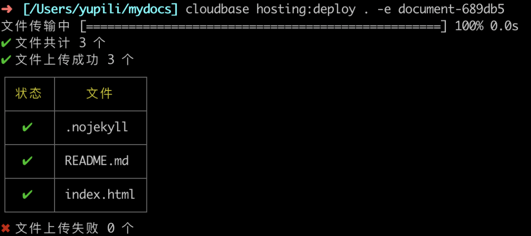 接着,本机打开终端,cd命令进入到mydocs目录中,执行cloudbase的deploy命令将目录中的静态网站文件给部署上去: