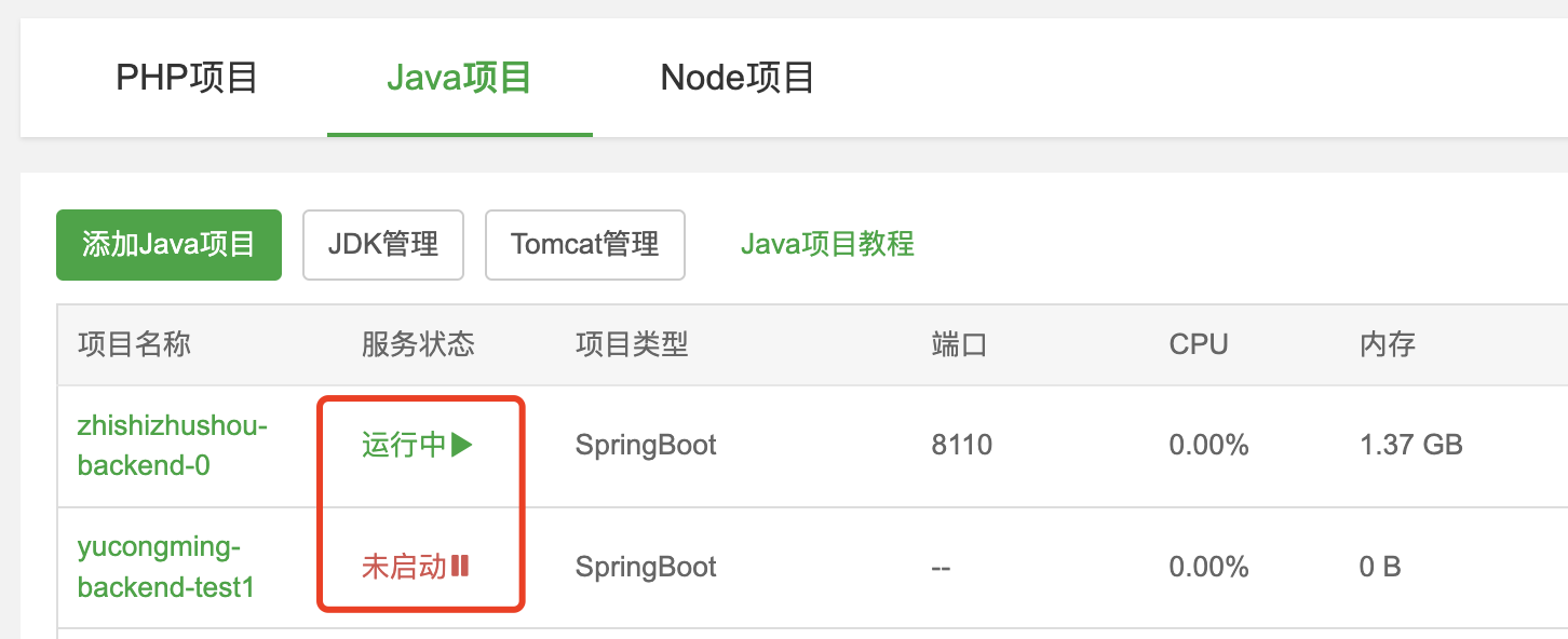 如果你使用的是宝塔 Linux 面板,而不是自己通过执行 jar 包命令来启动项目,那么这个坑更容易出现。因为有时候,项目刚启动的时候显示 “运行中”,但可能由于系统异常,过几秒钟就变成 “未启动了”。
