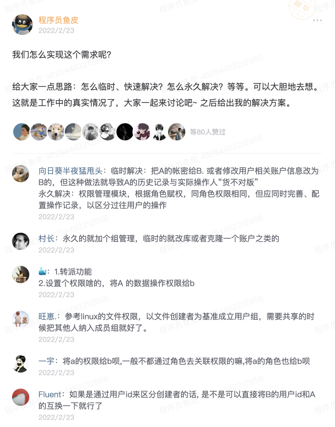 我大概率会选择方案 2。一般情况下来说,方案 1 开发最快,最好理解,但如果要同时给同组的很多人分配权限就很麻烦,增大了用户的操作成本;方案 3 虽然很灵活和完整,但开发成本最高,而且我们的这个系统并没有太多的 对象、角色、权限 ,用 RBAC 就有点大材小用了;而方案 2 相对最适用于当前的场景,并且由于系统本身就有权限组的管理功能,我只需要把任务和权限组关联起来就可以了,开发成本也是很低的。