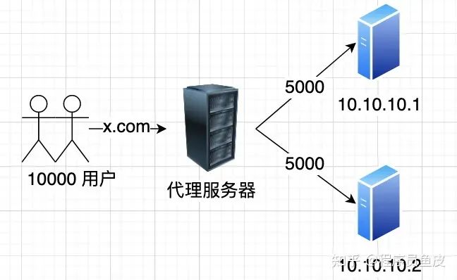 因此,我们还需要一台 代理服务器 ,对外提供 唯一 的入口,统一 接受用户的请求。再根据请求(或流量)的 特征 ,依据一定的 算法 ,将请求转发到内部的服务器集群中,如图: