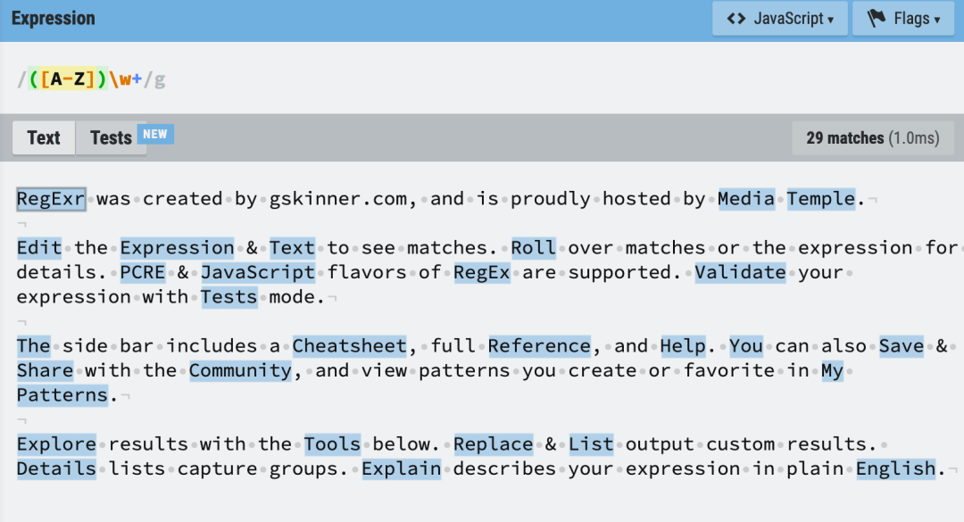 最后,正则表达式可是一门大学问,推荐一款学习、创建和测试正则表达式的在线可视化工具,RegExr。通过练习的方式学习,很快就能入门啦!