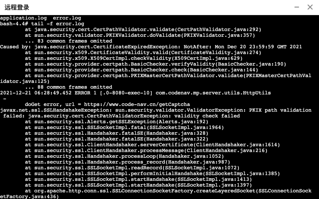 简单分析一下,公众号后台还能收到错误提示,说明能请求通编程导航的服务器,也就是说网络和机器层面应该没有问题。那就登录服务器查看业务日志,如图: