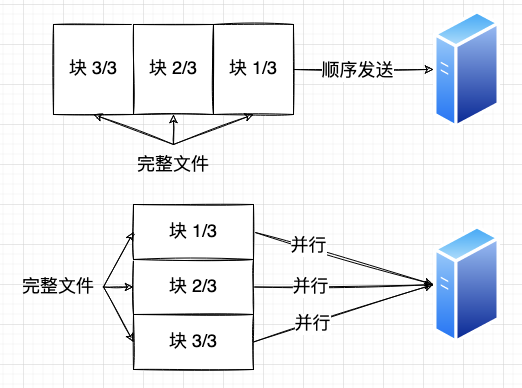 将大文件分块后,就可以通过多线程并发上传,同时传输多个块: