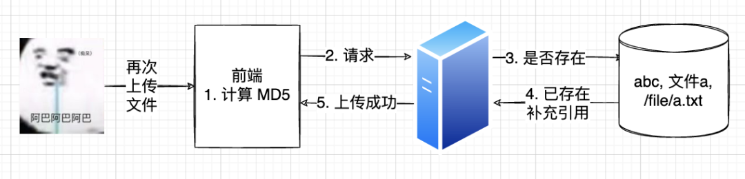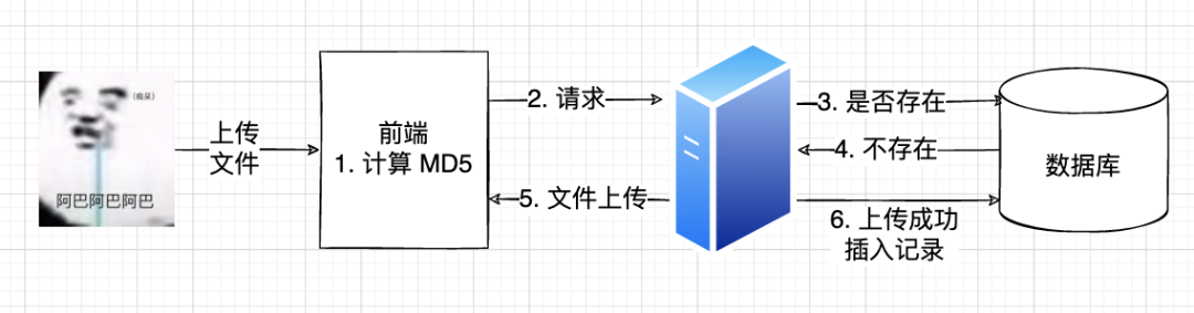 上传文件前,先在客户端(比如浏览器)根据文件内容计算出文件的 MD5 值,相同内容的文件 MD5 值必然相同。然后在服务器已上传文件数据库中查找该 MD5 对应的文件是否已存在。如果不存在,上传文件并在上传成功后将该文件信息插入数据库,过程如下: