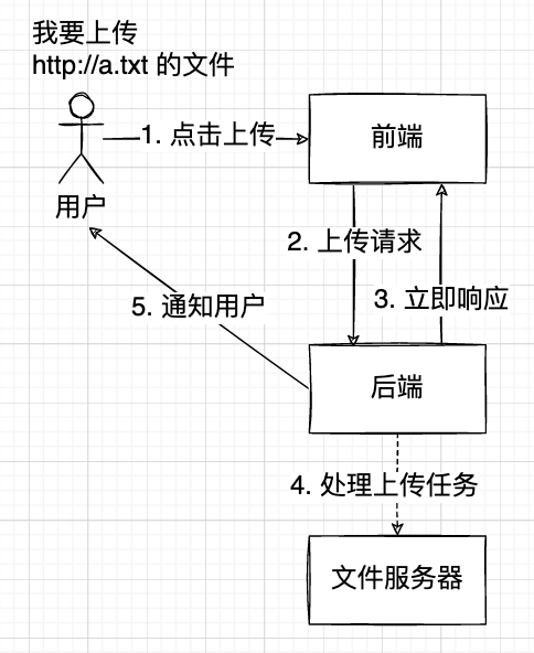用户输入要上传的文件 url,点击上传后,不需要一直在文件上传页面等着,而是只需要告诉后台 “我要执行文件上传”,并向后台新建一个文件上传任务,就可以快速响应用户了,比如 “文件上传中,请留意通知”。等后台取出并真正完成文件上传的任务后,给用户发送通知就可以了。