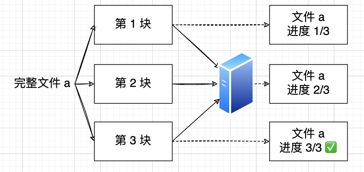 这样,服务器就能一块一块地接收,把这些文件块保存到临时目录中。当接收到最后一块时,把之前的所有文件块再拼接到一起,就能组成完成的原文件啦。