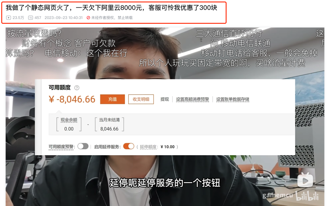 “我做了个静态网页火了,一天欠下 XX 云 8000 元,客服可怜我优惠了 300 块”