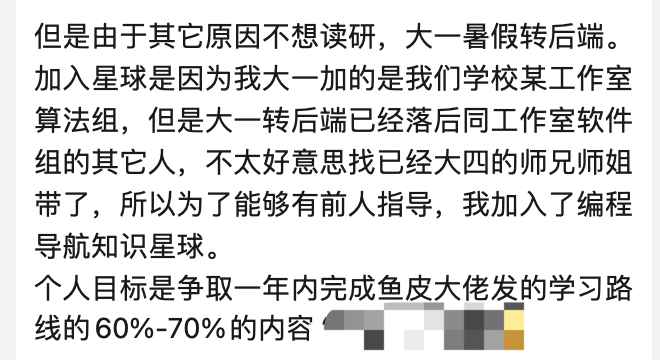 尤其是还没面临就业压力的大学朋友们,趁早准备起来吧,不亏。看看我 编程导航 里的学弟们现在基本都在努力了: