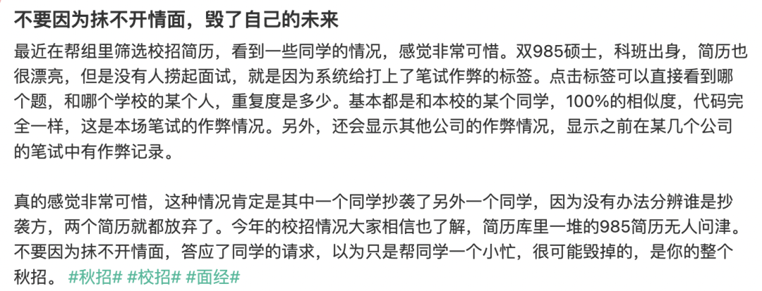 比如笔试作弊、简历造假事件,有的时候你自己可能都不知道自己被抓了,还在网上抱怨 “我 985 硕士找不到工作” 呢。