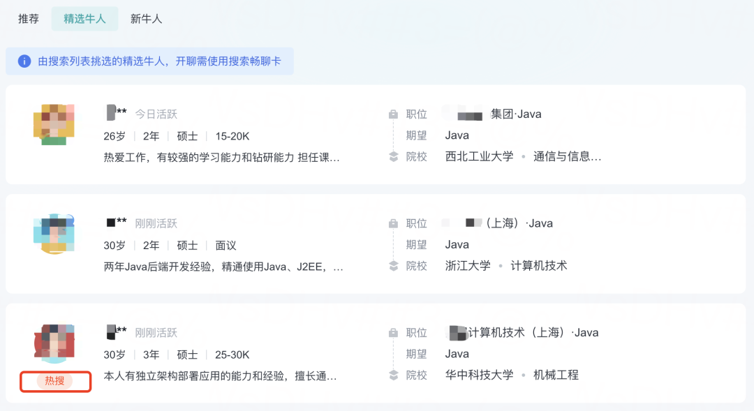发布完岗位后,平台就自动给我推荐了一些招聘者,而且让我震惊的是,这些招聘者中,竟然还有 “热搜” 招聘者,也就是找工作的红人?