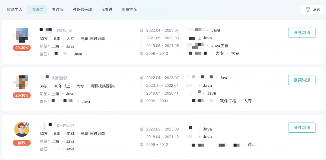当然,倒也不会只通过这种招呼语的方式去筛选求职者,后台还提供了直接看候选人基本求职信息的功能,我会在这里捞一捞符合要求的同学: