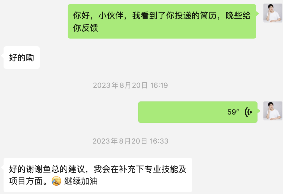 在这一轮筛选中,有同学是比较聪明的,能从我跟他不断沟通这件事感受到我的目的和意向,多说几句来主动争取机会。这显然是加分的: