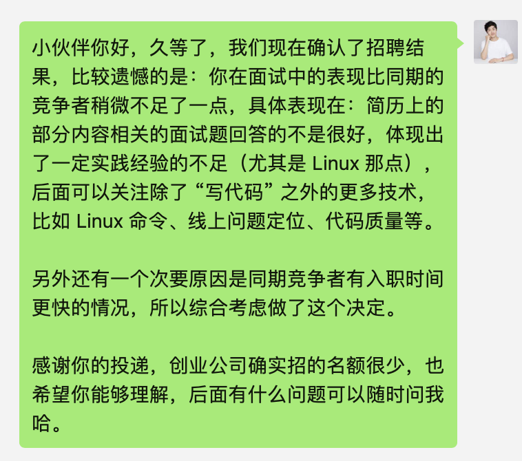 但本着包容的心态,即使在面试过程中提前发现候选人不符合要求,我也不会草草结束或者敷衍剩下的面试,而是鼓励候选人继续面试,直到面试结束才给大家提一些建议。