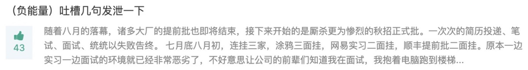 但求职的压力始终没有消散,不断面试不断失败,甚至电脑还进水了...... 那几天心态崩溃,我把自己的负面心情也记录在了牛客上,也有了很多牛友鼓励,甚至有人表示愿意先借我一台电脑,感动。