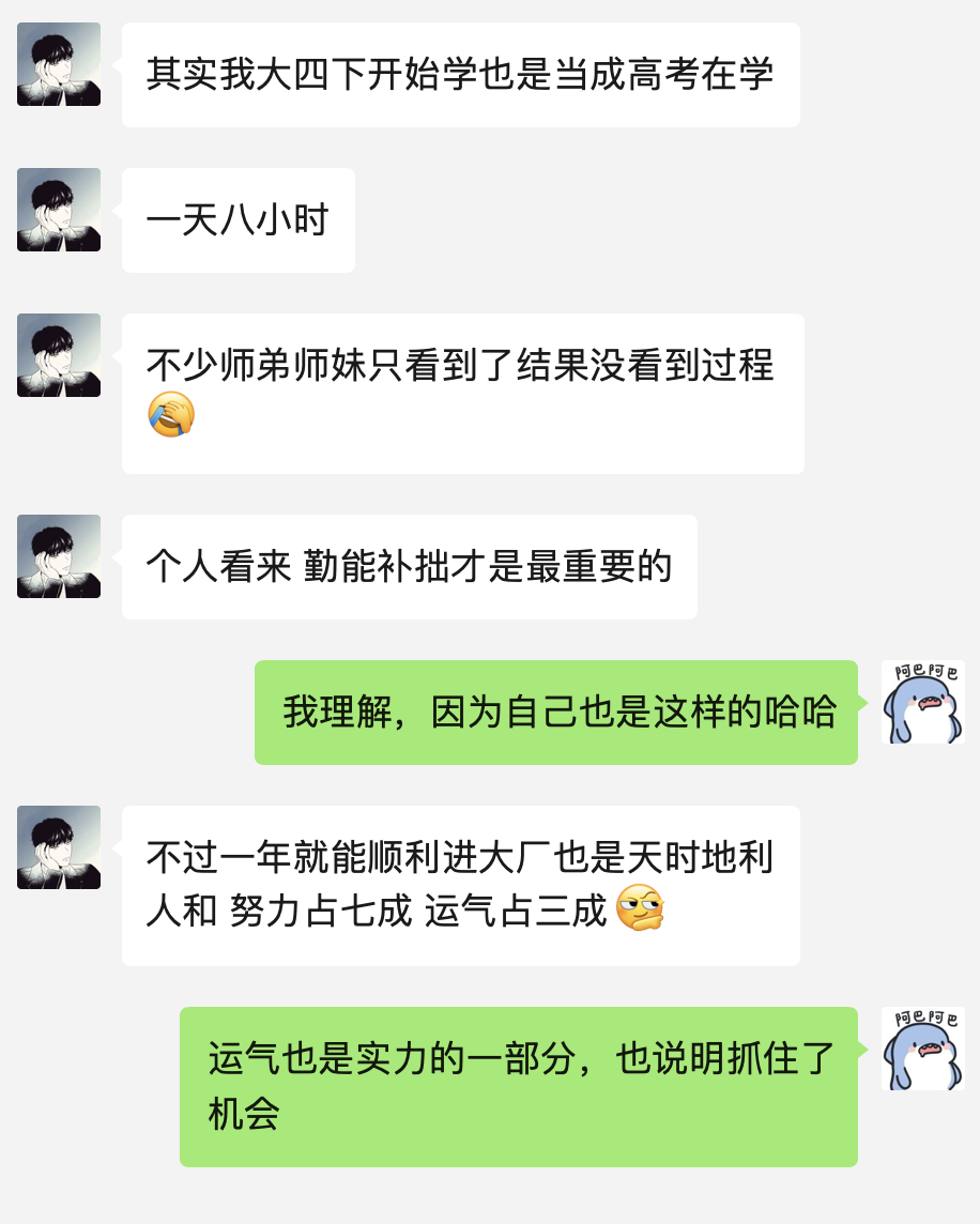 虽然进大厂也讲究天时地利人和,但正如我所说的,运气也是实力的一部分,小黑同学正是通过努力才一步步走到风口浪尖,然后顺势而为、主动出击,才拿到了令人心动的 offer。瑞思拜!