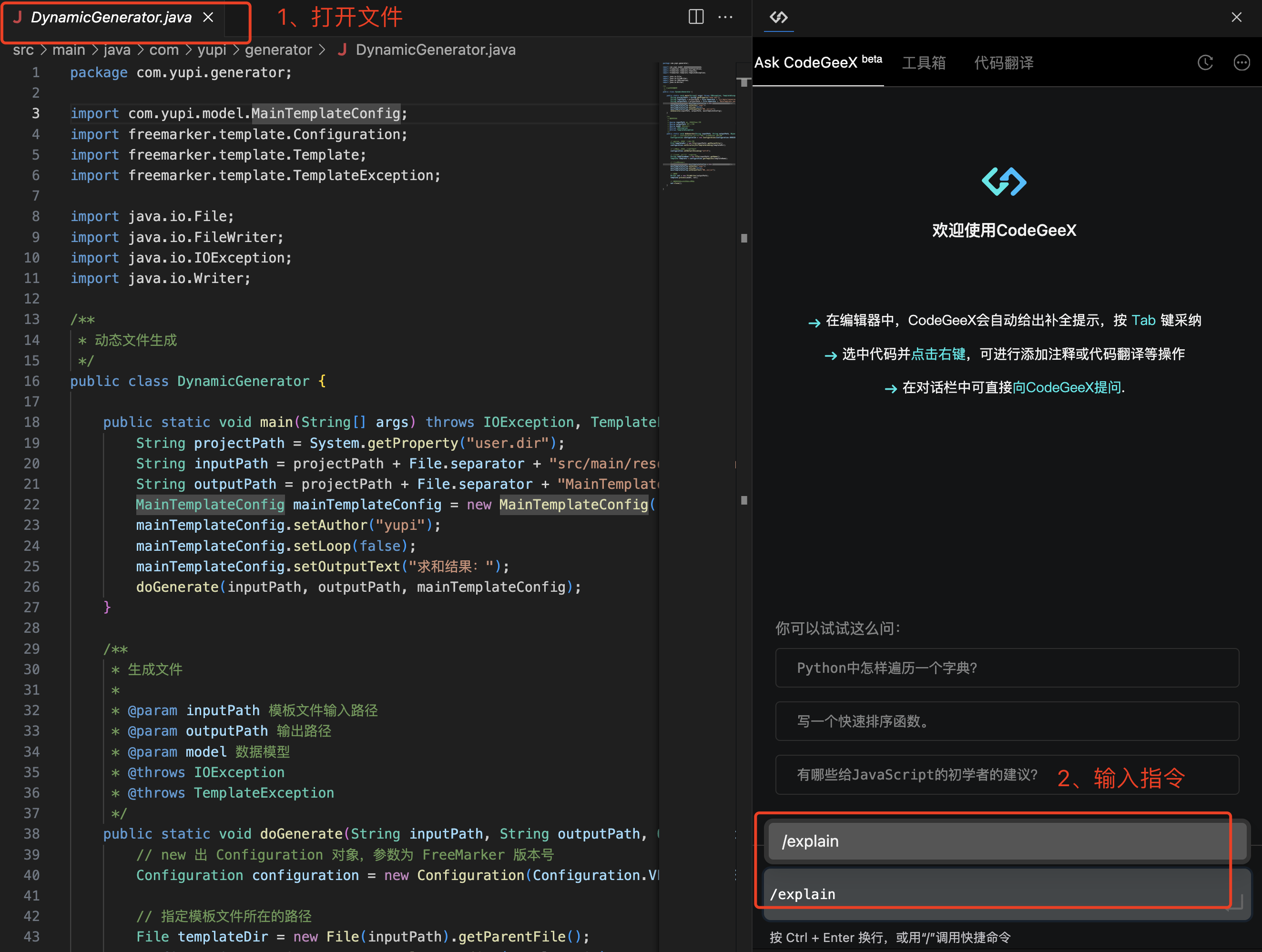 打开要分析的代码文件,然后在插件中输入 /explain 指令: