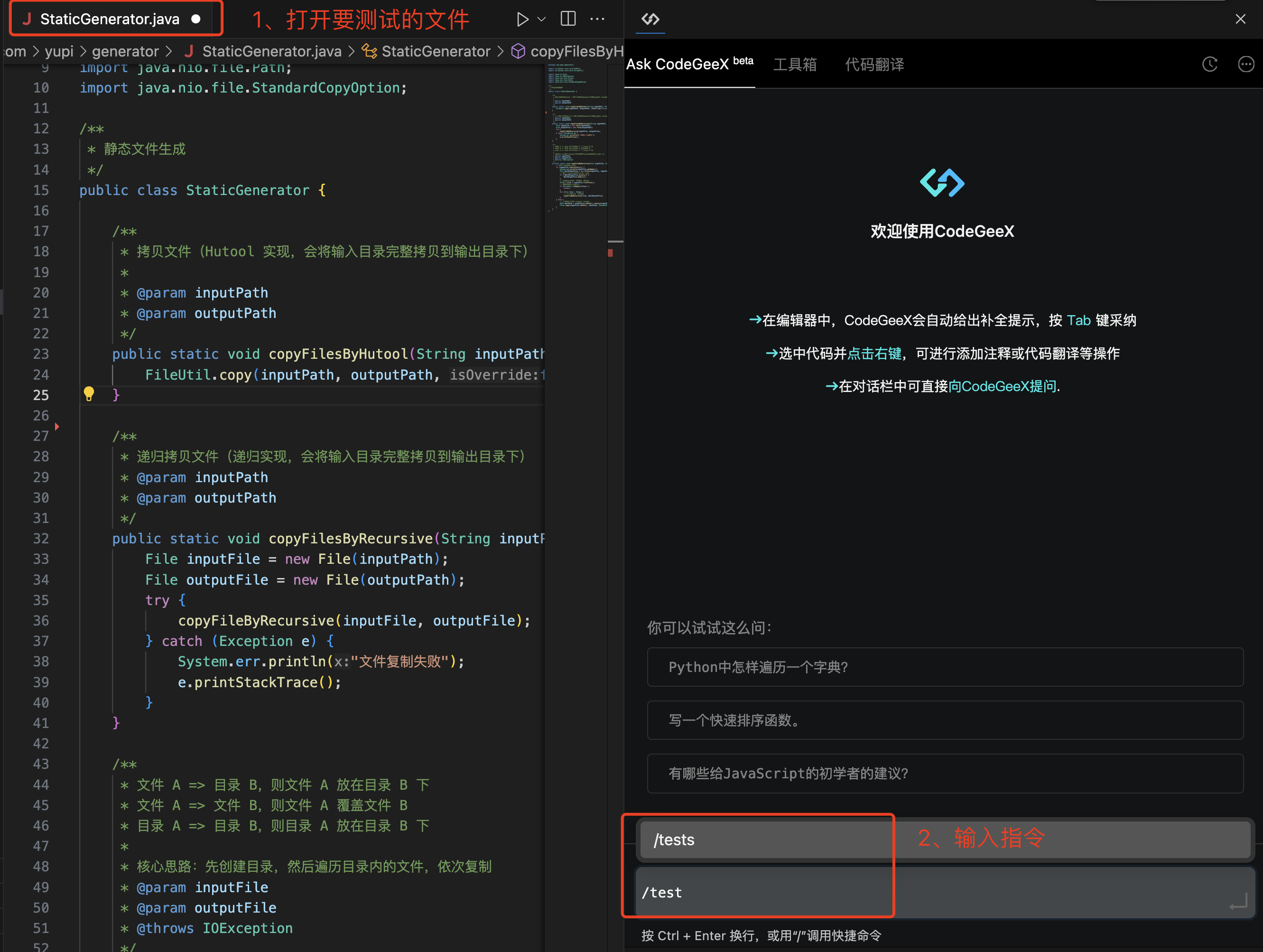 不过现在我们有了 AI 测试员,只要打开想测试的文件,然后输入 /tests 指令: