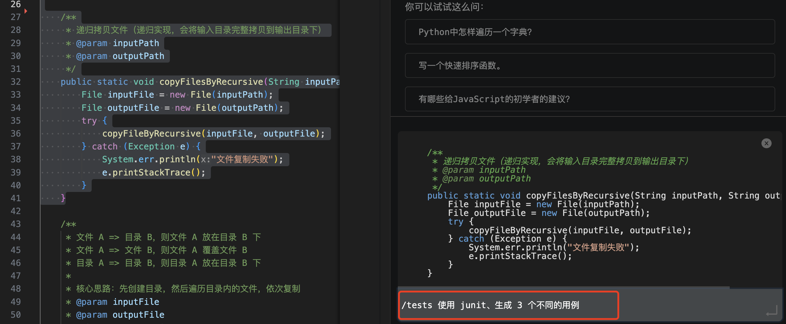 为了提高生成的准确度,我更建议大家选中要测试的方法,然后在输入 /tests 指令的同时,告诉 AI 你的要求,比如要使用什么单元测试框架、生成多少用例之类的: