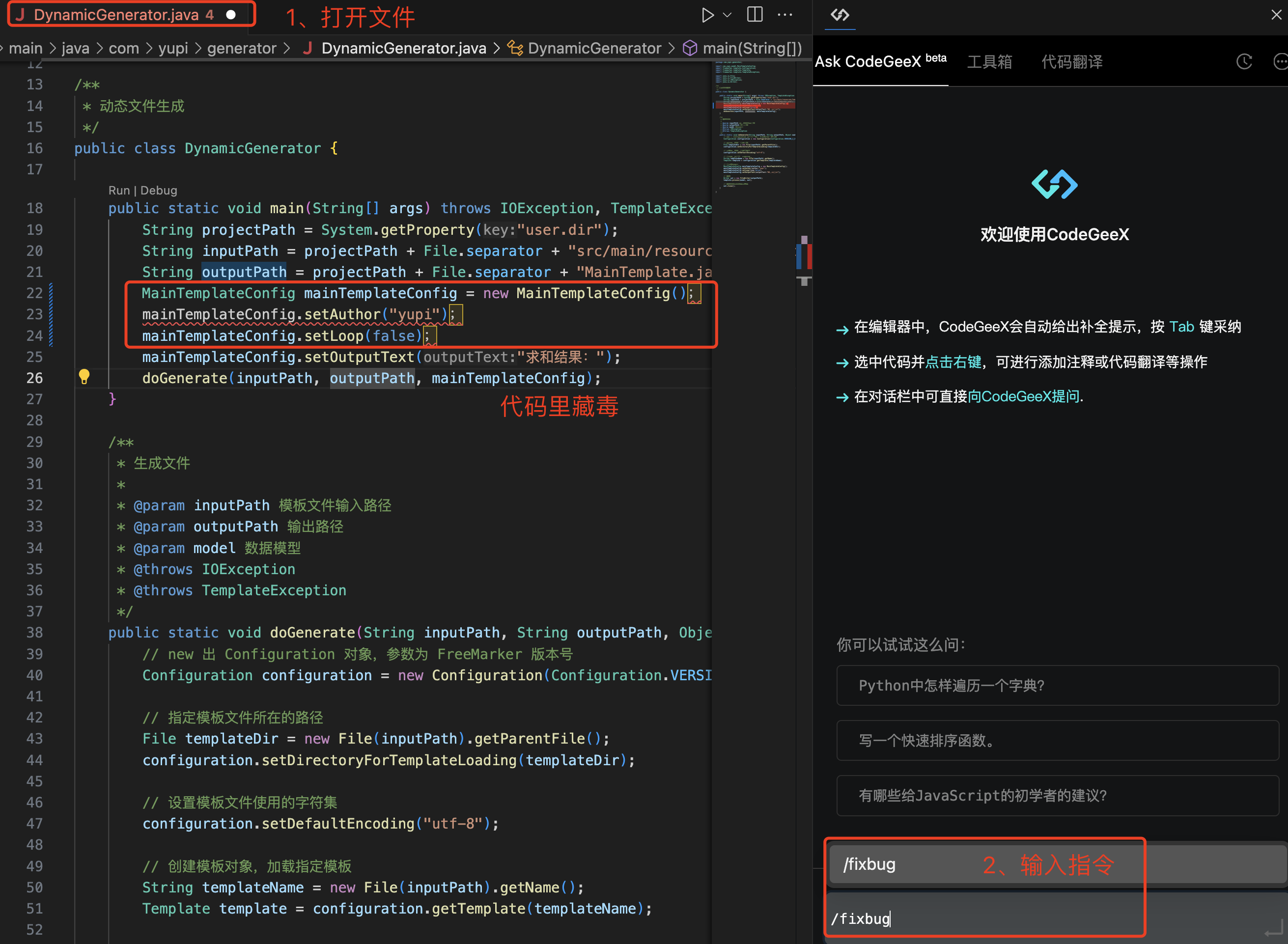 现在有了 AI Bug 修复师,我们只需要打开存在 Bug 的代码文件,然后输入 /fixbug 指令:
