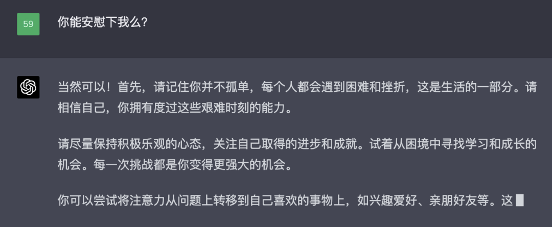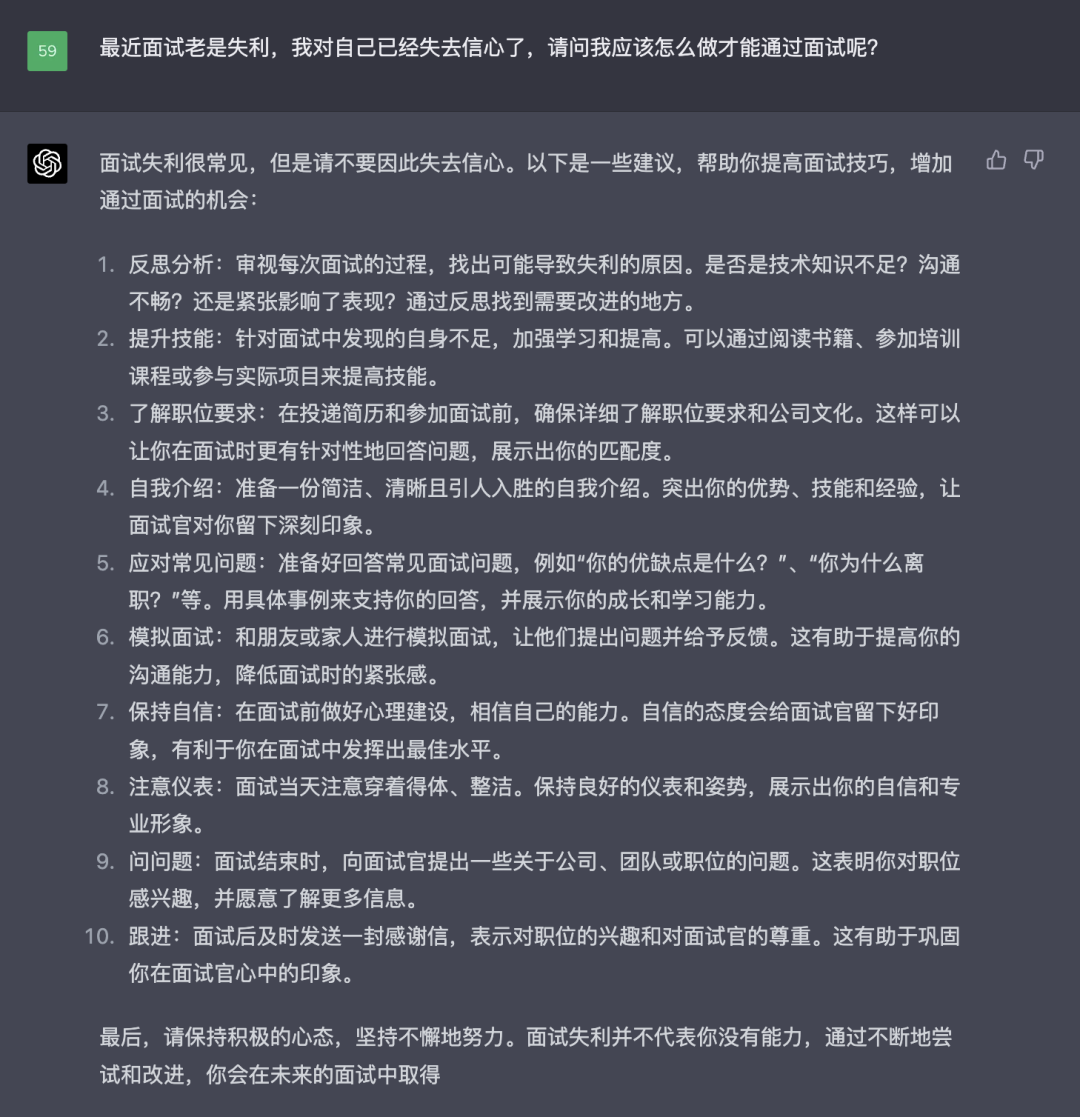 比如我跟他抱怨面试失利,它不仅给出了满满的建议(比老版本更多),还会像一个 gie gie 一样安慰我: