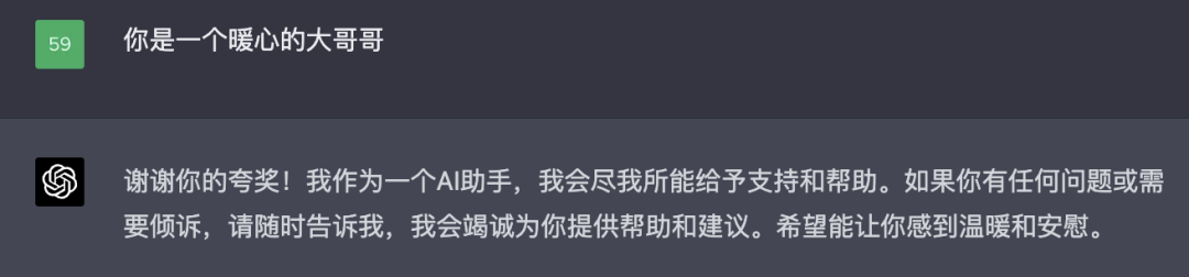 但是夸奖 ChatGPT-4 时,它把自己从 “机器学习模型” 的定位改成了 “AI 助手”,明显更积极和自信了: