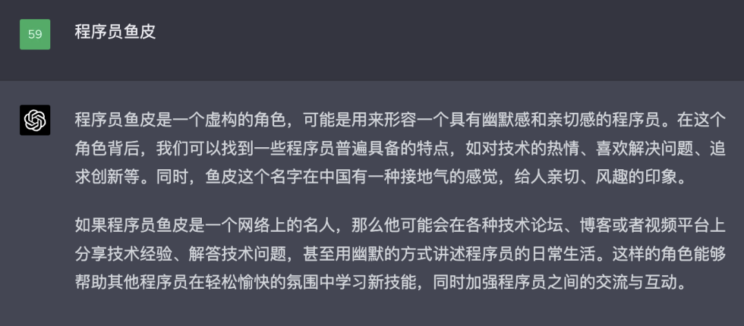 比如我直接跟它说 “程序员鱼皮”,老版本的 ChatGPT 直接就摊牌了 —— 劳资就是 AI:
