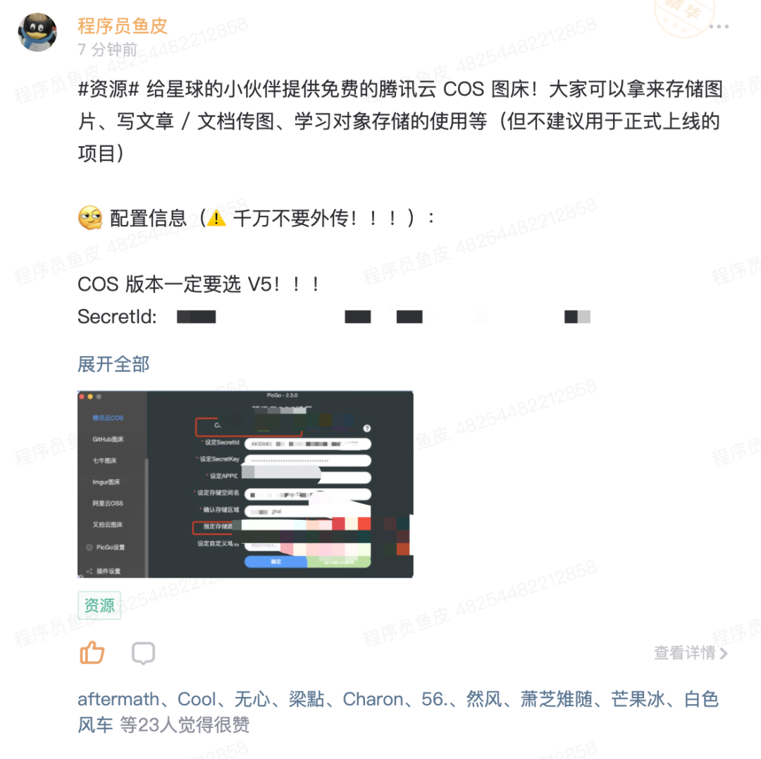 我也给自己 编程导航 内的小伙伴建设了一个 免费高速灵活 的图床(使用腾讯云 COS),帮助大家省去自己搭建的时间和金钱成本。