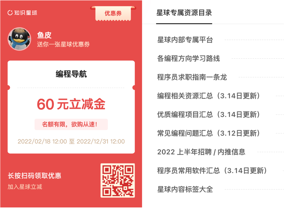 编程导航即将涨价,现在加入限时优惠 60 元 ,欢迎想学习编程、获得进步的小伙伴~
