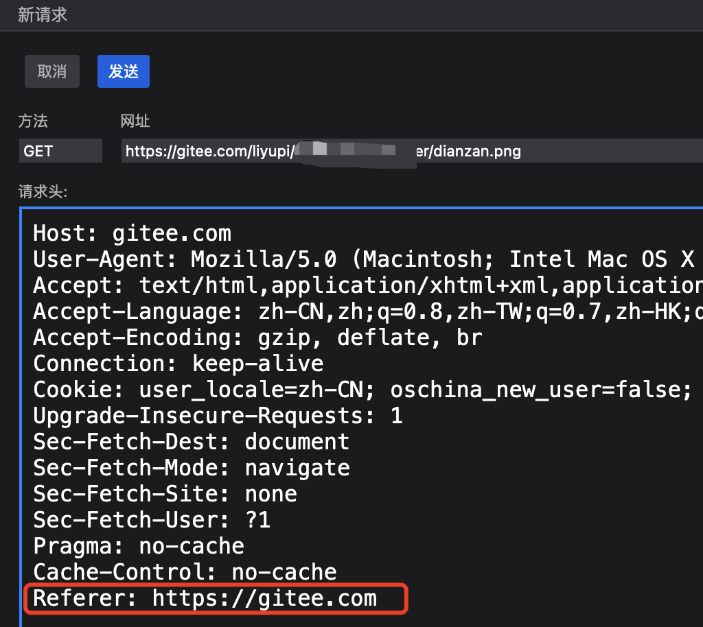 显然是 Gitee 给图片添加了 防盗链 ,一般情况下,服务端会从客户端的请求头中读取 Referer,通过判断 referer 头是否在白名单中,来决定正常响应图片还是拦截。