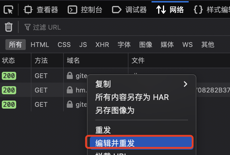 然后我们在 F12 开发者工具中找到刚刚的图片请求,点击编辑并重发: